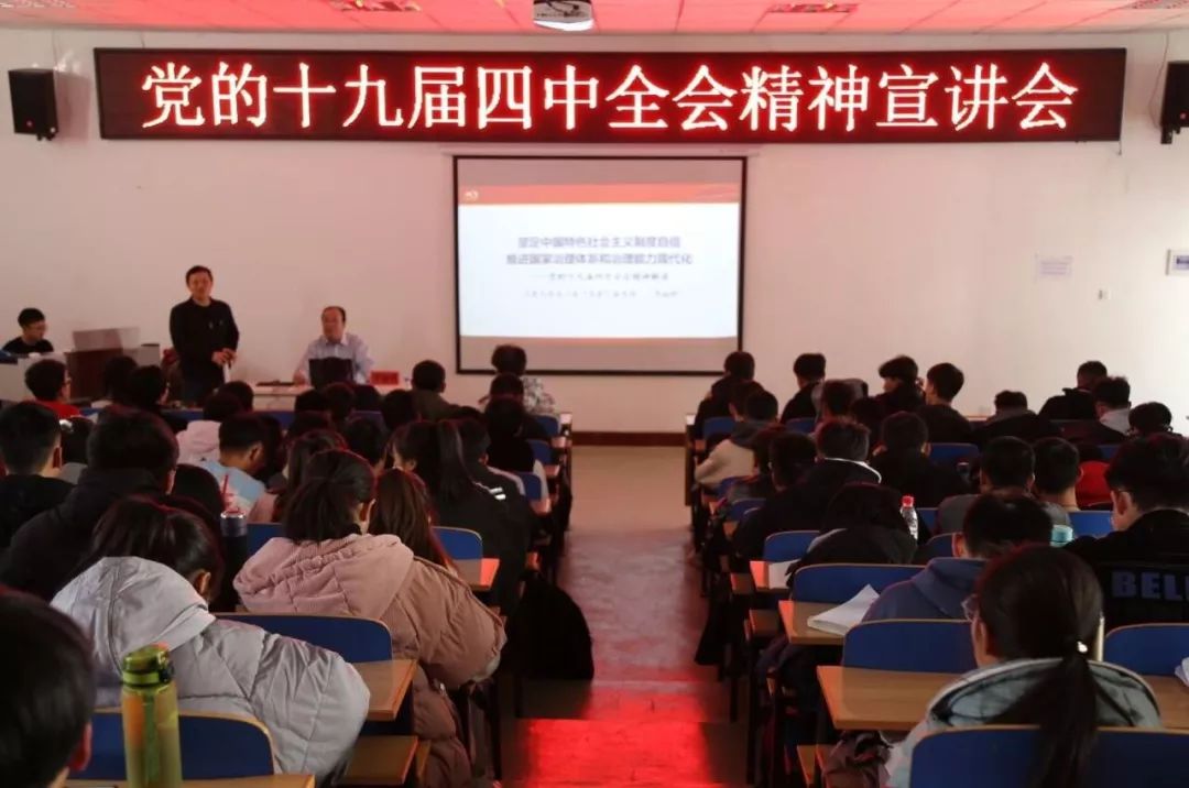 本次宣讲会让同学们了解了十九届四中全会精神。同学们纷纷表示要深入学习贯彻习近平新时代中国特色社会主义思想和党的十九届四中全会精神,不辜负党和人民的期待,不断提升自我。